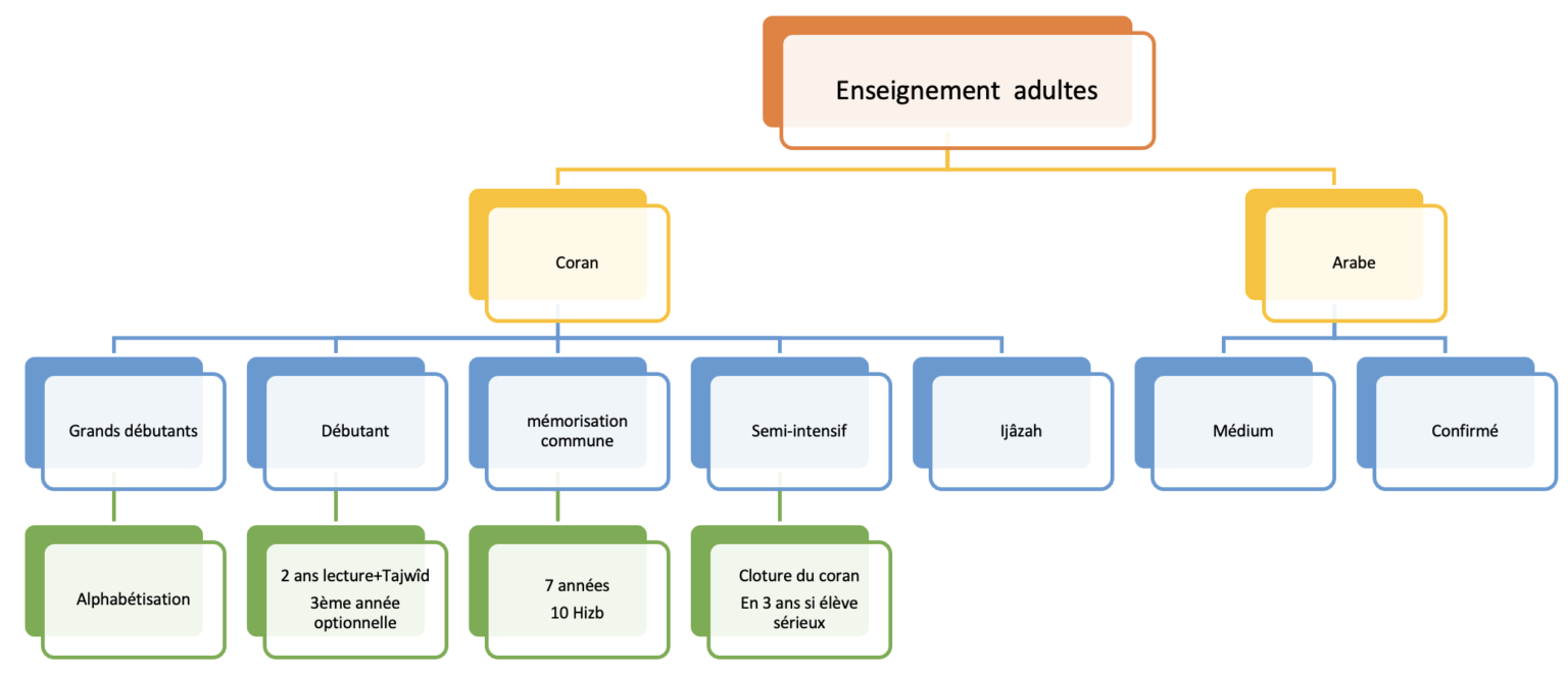 - Mardi 9h-11h30 (mémorisation et Tilâwah) ET jeudi 9h-11h30 (Révision et matières théoriques) les cours sont dispensés uniquement en langue arabe